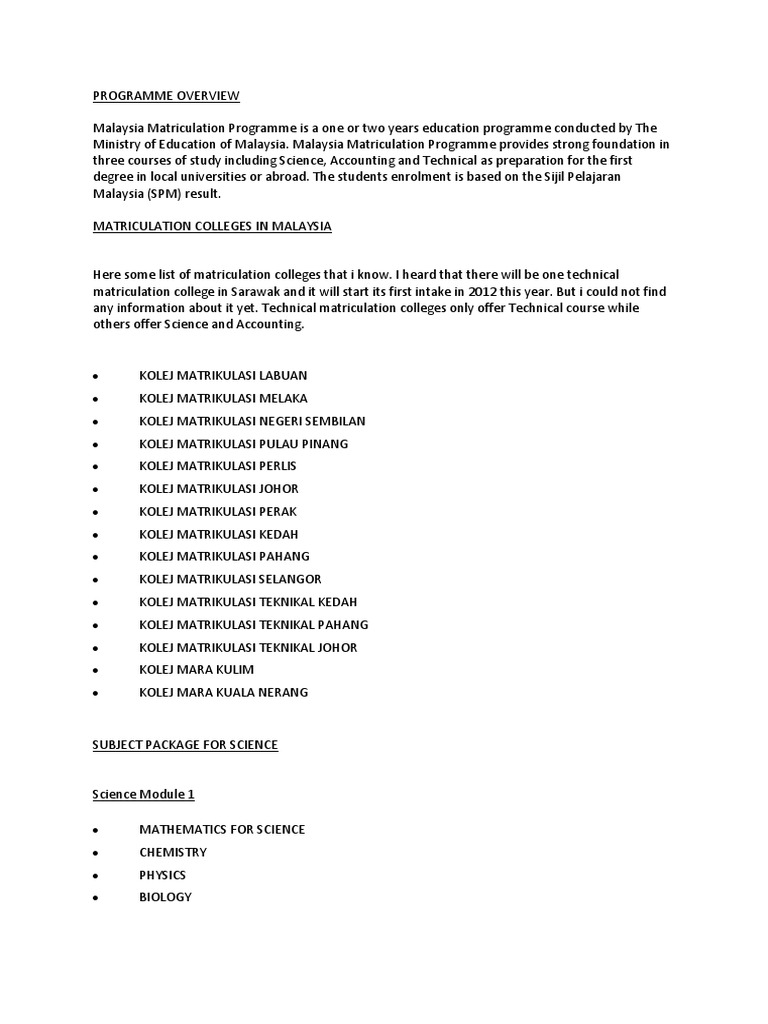 Chemistry syllabus at matriculation.