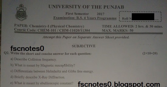 Bs Hons Chemistry Past Papers Semester 1 Chemistry I Physical Chemistry