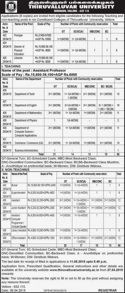 Thiruvalluvar University Recruitment 2015 Application Form For 144 Assistant Professor Posts Jr Assistant Lab Assistant Posts Tamilanguide Official Website