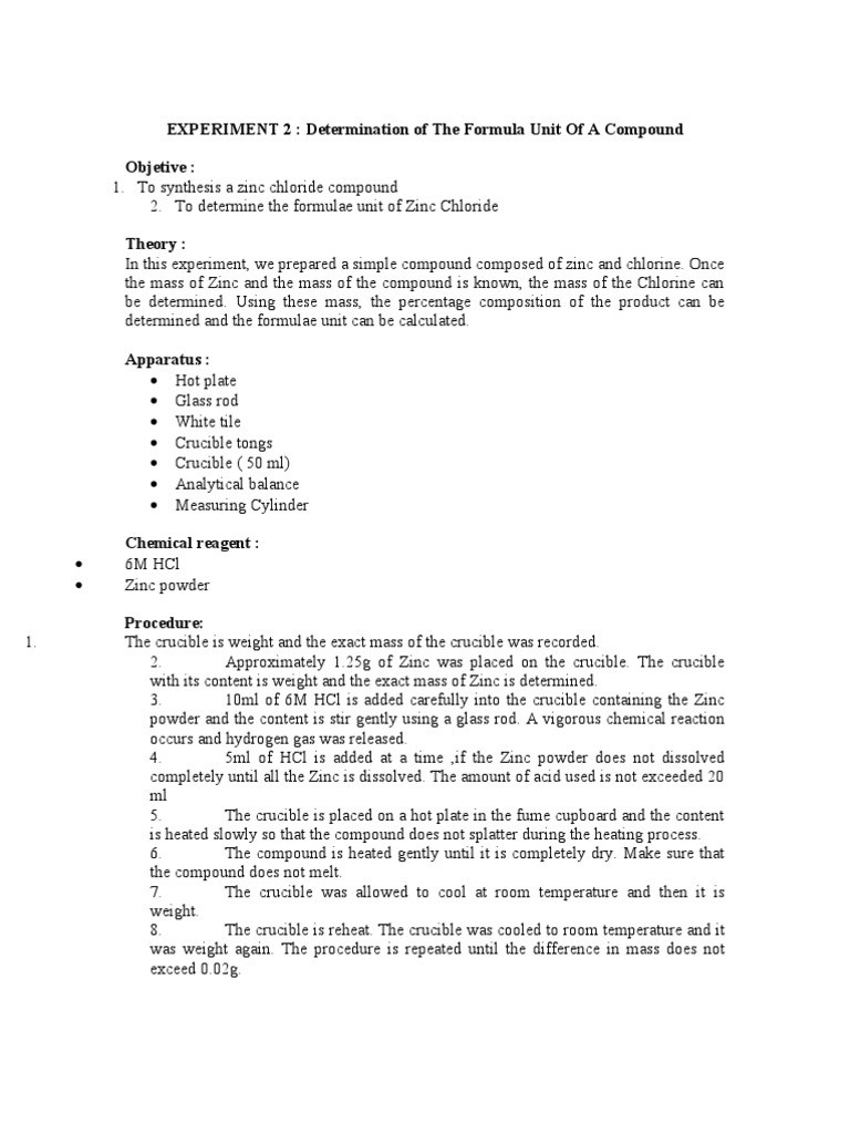 Chemistry Lab Man Experiment 2 5 Pst Experiment 2 Determination Of The Formula Unit Of A Compound Objectives I Ii To Synthesise A Zinc Chloride Course Hero