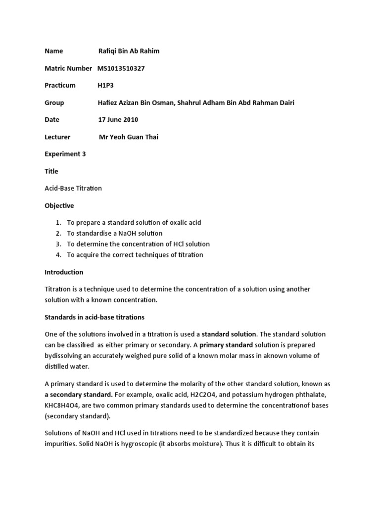 Experiment 2 Titration To Determine Concentration Of A Weak Acid Pdf Experiment 2 Acid Base Titration Each Person Will Do This Laboratory Course Hero